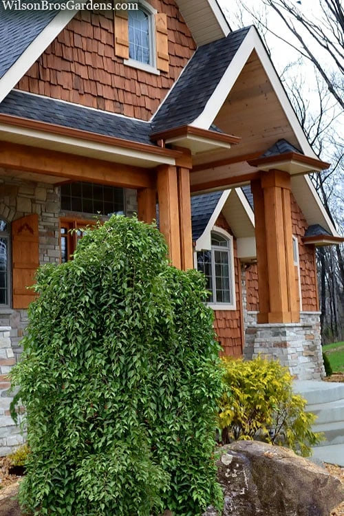 PLEASE NOTE:Â This variety is a cross between ‘Rosea’ and ‘Carillon’, which gives it it’s more compact and weeping habit. The plants we grow will look low and mounding. As the tree grows it will form a central leader that grows more upward. The central leader can also be trained to grow upright by attaching a bamboo or other type of stake to it.