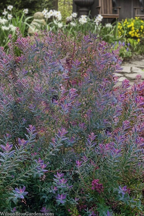 Here’s a colorful North American native evergreen shrub that pleases both the eyes and taste buds, making it an excellent choice for edible landscaping. In spring, bright purplish pink new leaves cover the 3 to 4 feet high and wide dense mound. In summer the leaves turn to a dusty blue-green with fall bringing shades of deep red and purple. An abundance of urn-shaped white to light pink flowers appear over a long period in spring developing into edible, sweet blue-black berries that can be picked and eaten right off the bush from late spring through summer. The berries are also great for use in making jams or preserves.Â